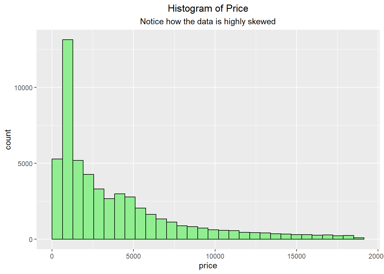 library(ggplot2)ggplot(diamonds, aes(x=price)) +geom_histogram(bins=30, fill="lightgreen", color="black") +labs(title ="Histogram of Price", subtitle="Notice how the data is highly skewed") +theme(plot.title =element_text(hjust=0.5),plot.subtitle =element_text(hjust=0.5))
