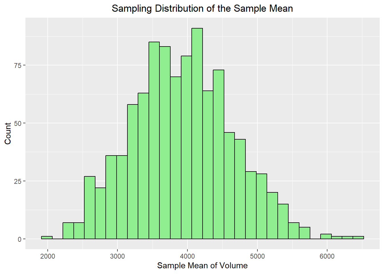 ggplot(mean_df, aes(x = stat)) +geom_histogram(bins =30, fill="lightgreen", color="black") +labs(title ="Sampling Distribution of the Sample Mean",x ="Sample Mean of Volume",y ="Count") +theme(plot.title =element_text(hjust=0.5))