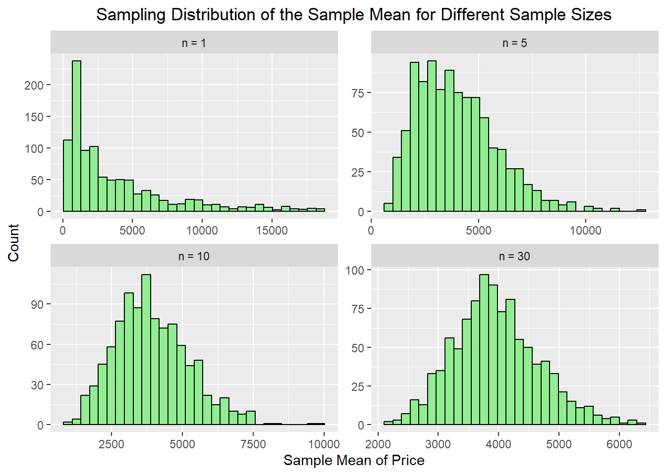 mean_n1 <-sampling_distribution(diamonds$price, sample_size =1, n_samples =1000, FUN = mean)mean_n5 <-sampling_distribution(diamonds$price, sample_size =5, n_samples =1000, FUN = mean)mean_n10 <-sampling_distribution(diamonds$price, sample_size =10, n_samples =1000, FUN = mean)mean_n30 <-sampling_distribution(diamonds$price, sample_size =30, n_samples =1000, FUN = mean)mean_compare <-tibble(`n = 1`= mean_n1, `n = 5`= mean_n5, `n = 10`= mean_n10, `n = 30`= mean_n30) |>pivot_longer(everything(), names_to ="sample_size", values_to ="stat") |>mutate(sample_size =factor(sample_size, levels =c("n = 1", "n = 5", "n = 10", "n = 30")))ggplot(mean_compare, aes(x = stat$stat)) +geom_histogram(bins =30, fill="lightgreen", color="black") +facet_wrap(~ sample_size, scales ="free") +labs(title ="Sampling Distribution of the Sample Mean for Different Sample Sizes",x ="Sample Mean of Price",y ="Count") +theme(plot.title =element_text(hjust=0.5))