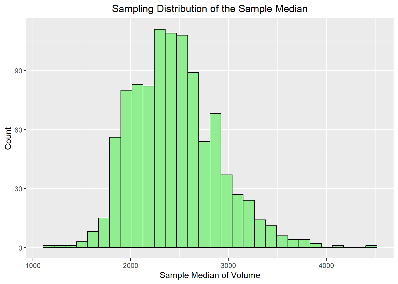 ggplot(median_df, aes(x = stat)) +geom_histogram(bins =30, fill="lightgreen", color="black") +labs(title ="Sampling Distribution of the Sample Median",x ="Sample Median of Volume",y ="Count") +theme(plot.title =element_text(hjust=0.5))