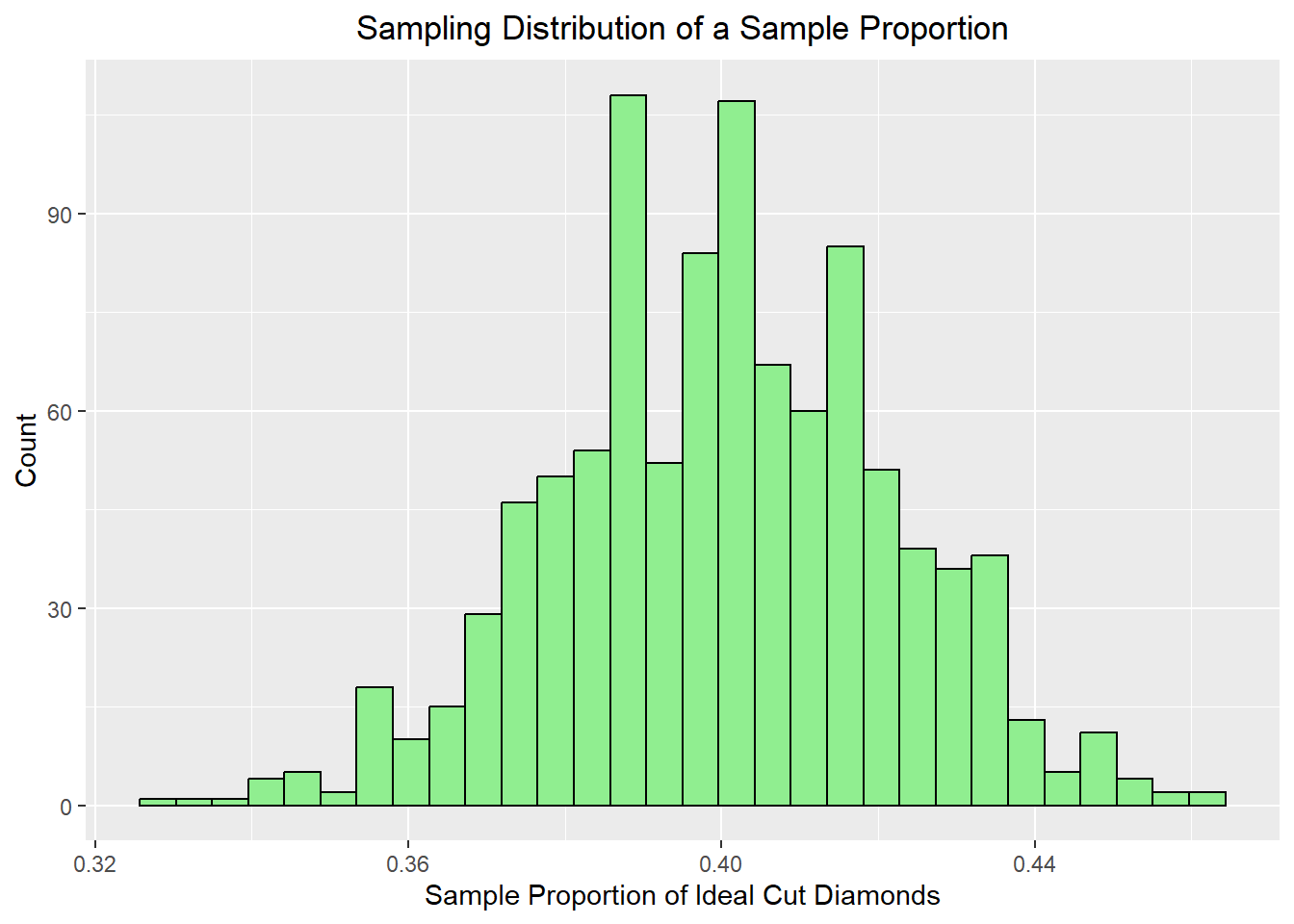 ggplot(prop_df, aes(x = stat)) +geom_histogram(bins =30, fill="lightgreen", color="black") +labs(title ="Sampling Distribution of a Sample Proportion",x ="Sample Proportion of Ideal Cut Diamonds",y ="Count") +theme(plot.title =element_text(hjust=0.5))
