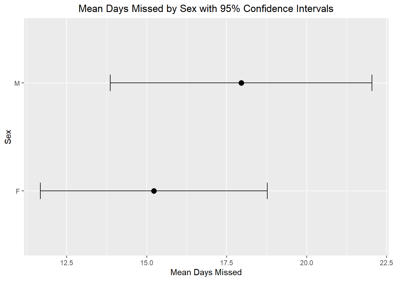 labs(title = "Mean Days Missed by Sex with 95% Confidence Intervals",