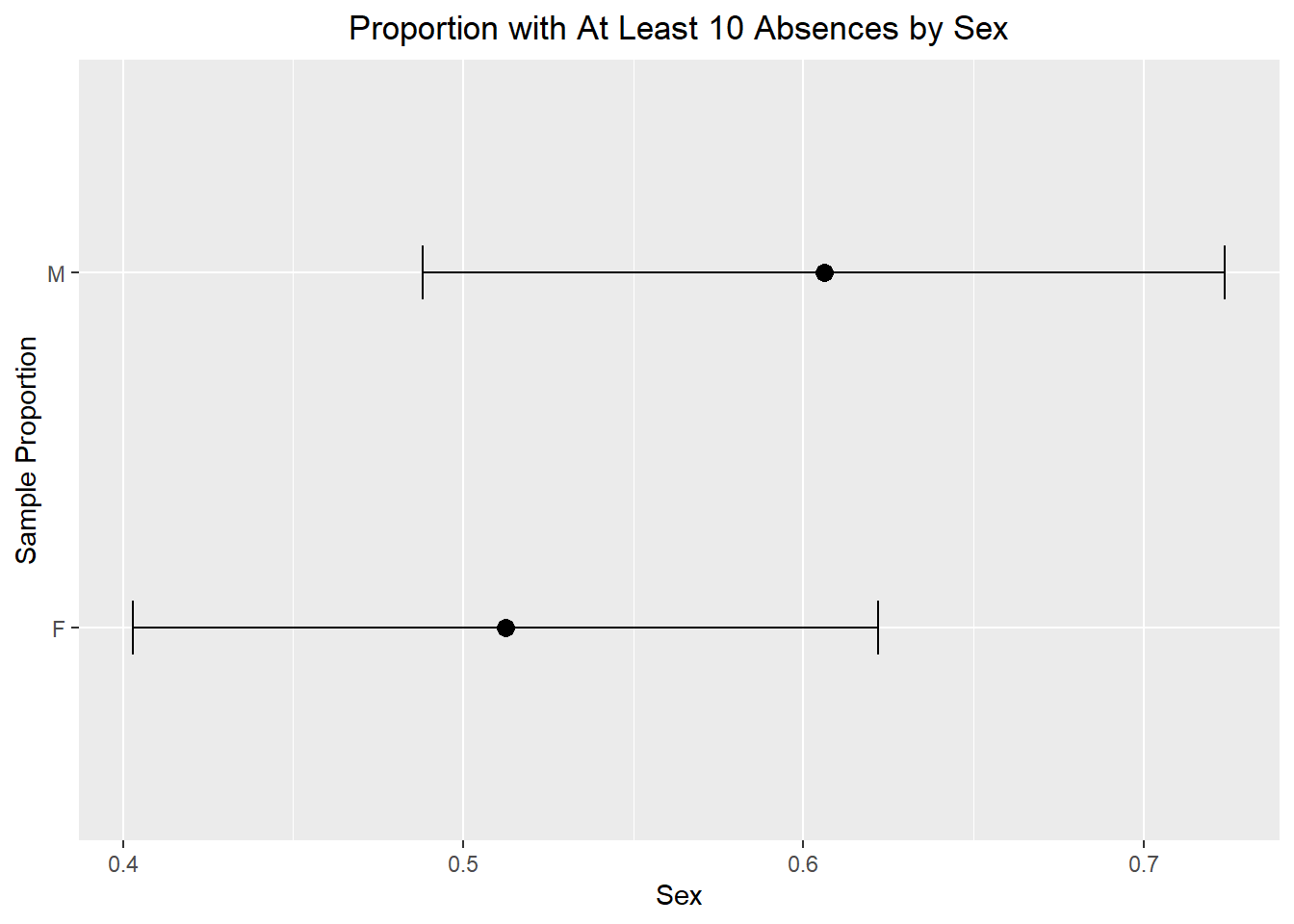 In this graph, each point represents the sample proportion of students in that group who missed at least 10 days of school. The error bars show a 95% confidence interval for the population proportion. This helps us compare the groups while also remembering that our estimates come from a sample and therefore contain uncertainty.