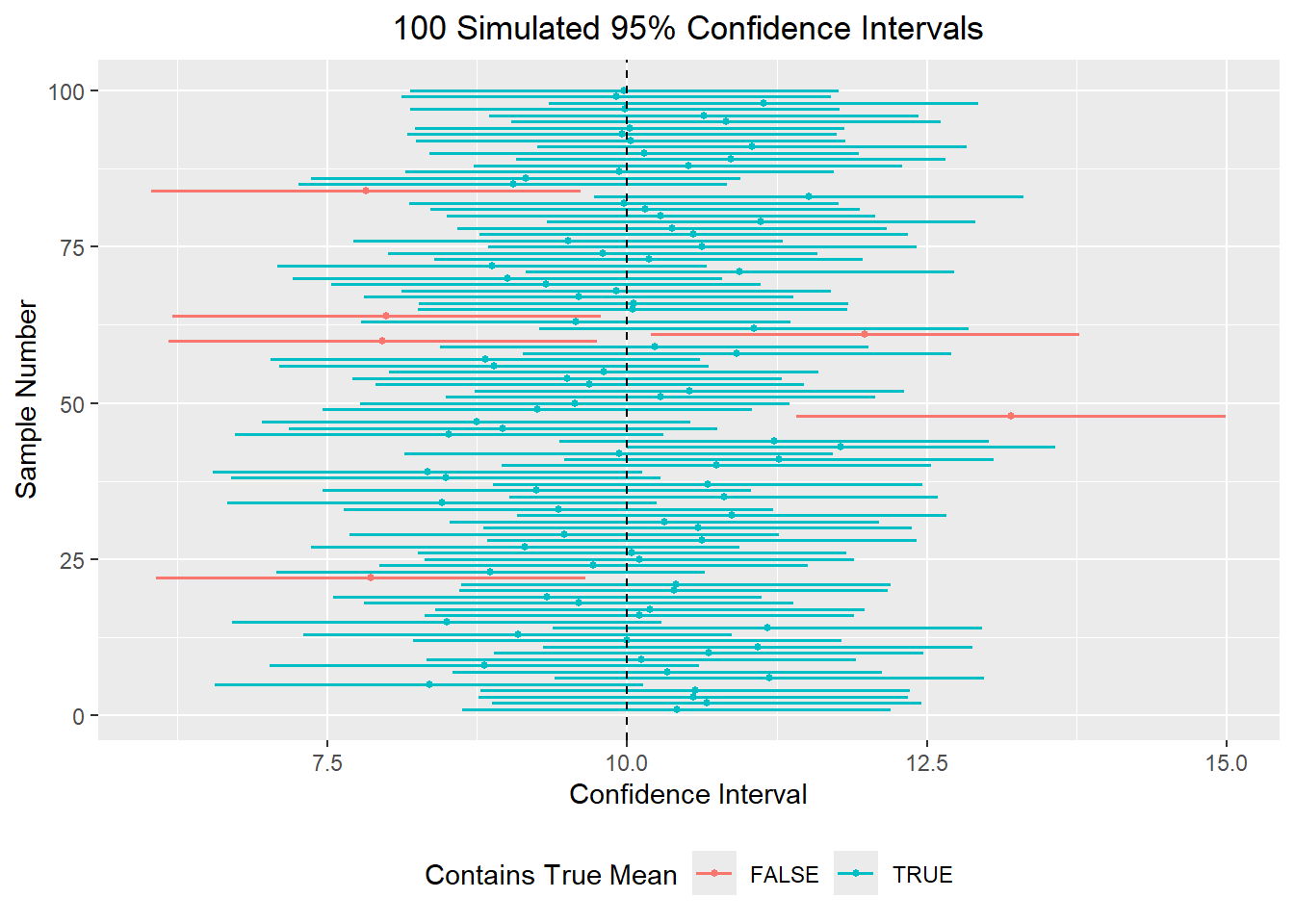 If we construct a 95% confidence interval from each sample, then most of those intervals should contain the true population mean of 10, but a few will not. In the long run, about 95% of the intervals should capture the true mean.