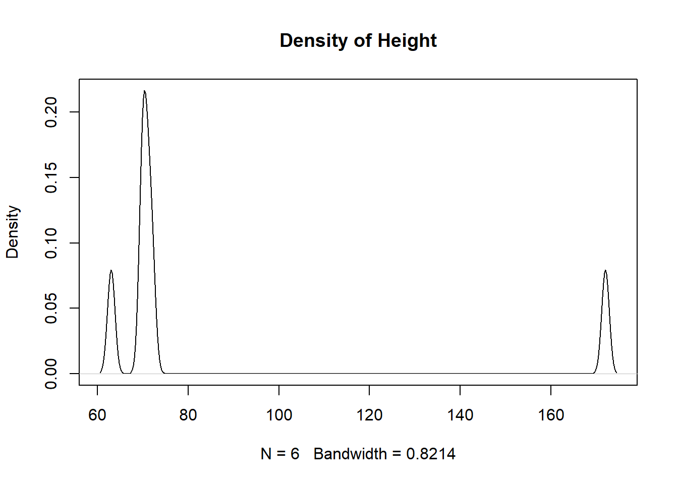 plot(density(df$height, na.rm=TRUE), main="Density of Height")