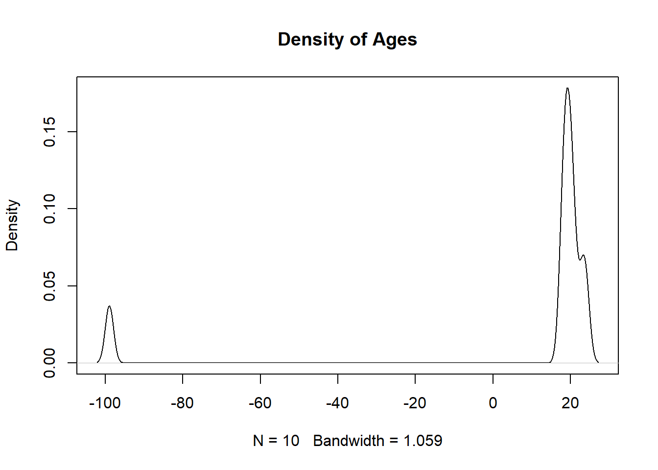 plot(density(df$ages, na.rm=TRUE), main="Density of Ages")